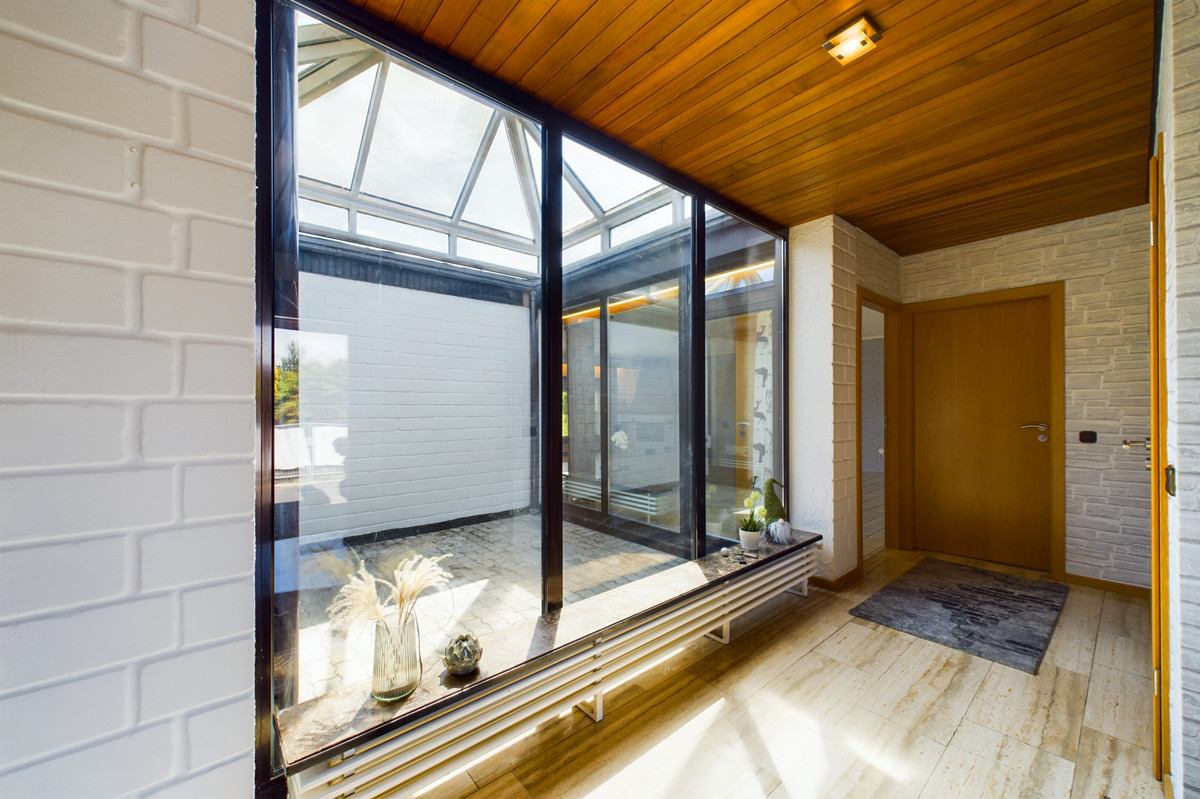 Ein besonderes Highlight ist der kleine Innenhof im Zentrum des Hauses, der nicht nur für viel Licht sorgt, sondern auch eine angenehme Atmosphäre schafft. Eine Küche, ein Schlafzimmer und ein separates Gäste-WC ergänzen das Raumangebot. Zwei Abstellräume bieten reichlich Stauraum.