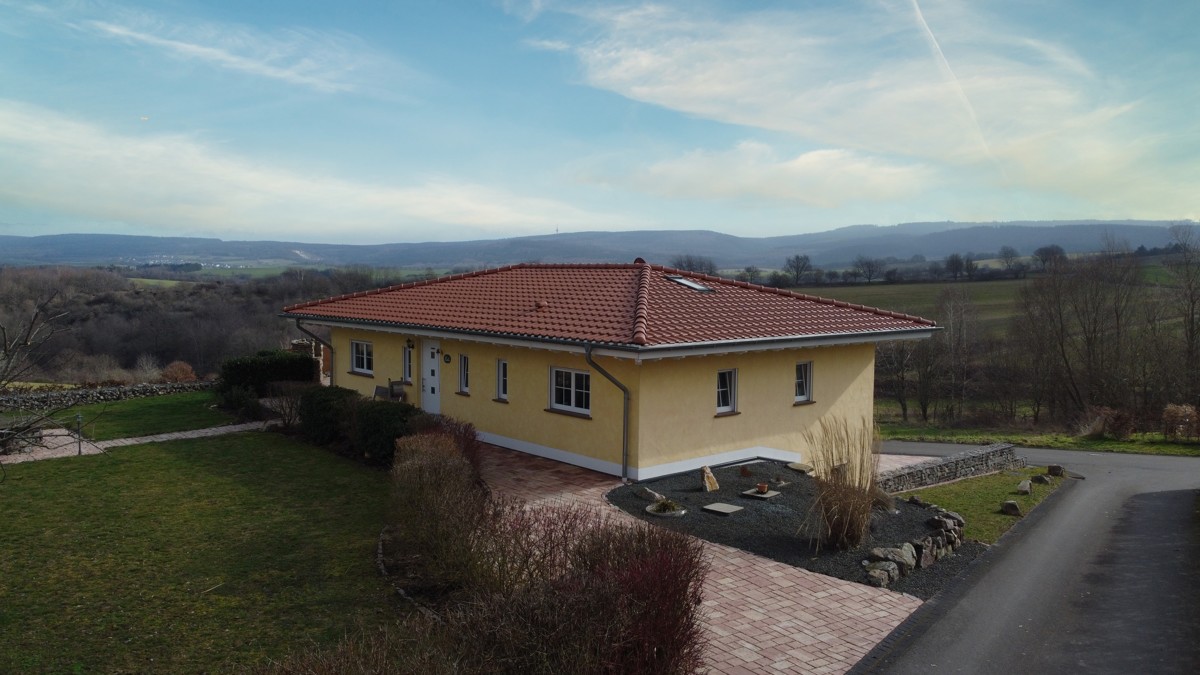 Dieser freistehende Bungalow mit einem wunderschönen Grundstück, zwei Garagen und einem traumhaften Panoramablick über den Hunsrück liegt am Ortsrand von Immert.
