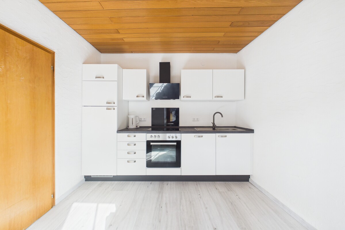 Das Obergeschoss kann bei Bedarf auch als separater Wohnbereich genutzt werden. Hier befinden sich eine weitere Küche sowie ein Wohnbereich, welcher auch über einen separaten Zugang von der Terrasse erreichbar ist. Zusätzlich stehen zwei Schlafzimmer sowie ein weiteres Zimmer zur Verfügung, das sich individuell nutzen lässt, zum Beispiel als Büro oder zusätzliches Gästezimmer. Abgerundet wird diese Etage durch ein Badezimmer mit Dusche und Badewanne.
