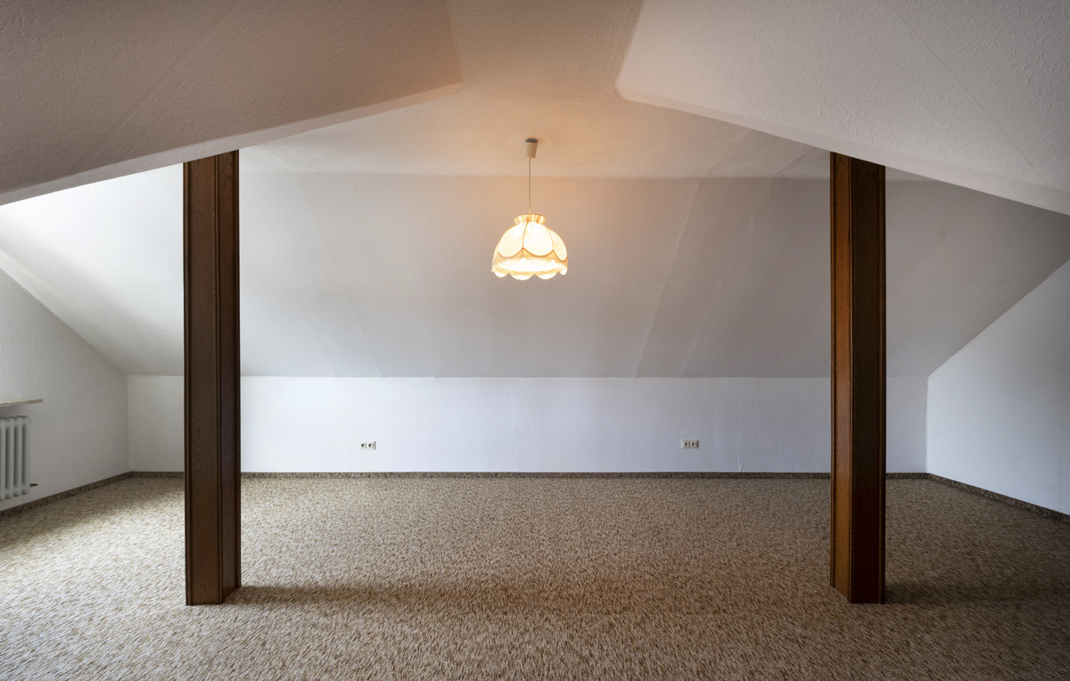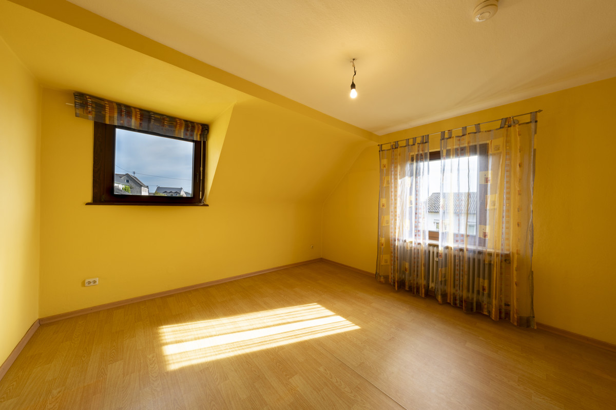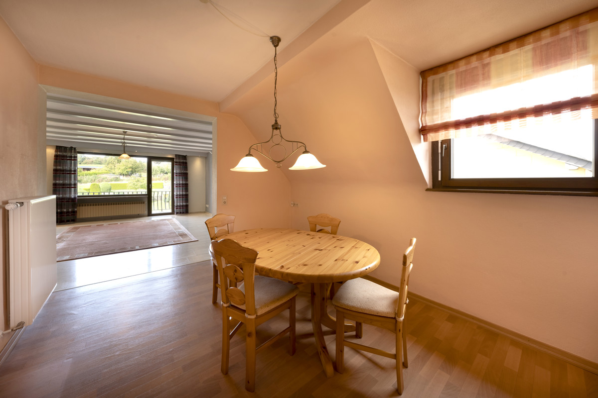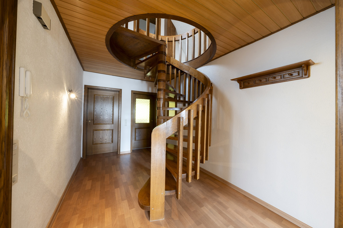 Die zweite Wohneinheit im Obergeschoss erstreckt sich über zwei Etagen und ist somit ideal für eine größere Familie. Das Wohnzimmer öffnet sich zu einem charmanten Balkon, der sich perfekt für entspannte Momente an der frischen Luft eignet. Angrenzend befinden sich die Küche und das Esszimmer. Zwei weitere Schlafzimmer und ein Badezimmer vervollständigen diese Ebene. Eine Wendeltreppe führt in das Dachgeschoss, wo Sie einen zusätzlichen Wohnraum sowie ein Büro vorfinden.