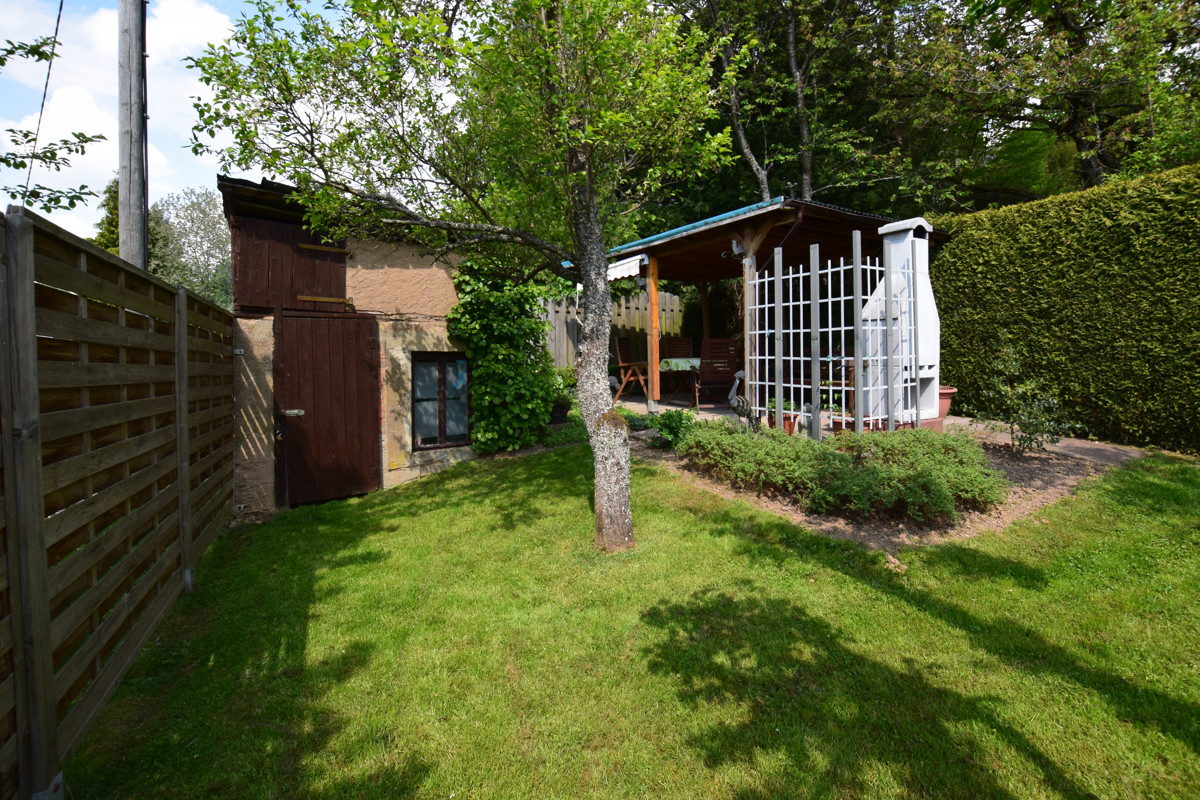Bei einer Nutzung der Immobilie als Ferienhaus kommt dieser pflegeleichte Garten, in dem auch verschiedene Obstbäume stehen, problemlos einige Zeit alleine klar.
