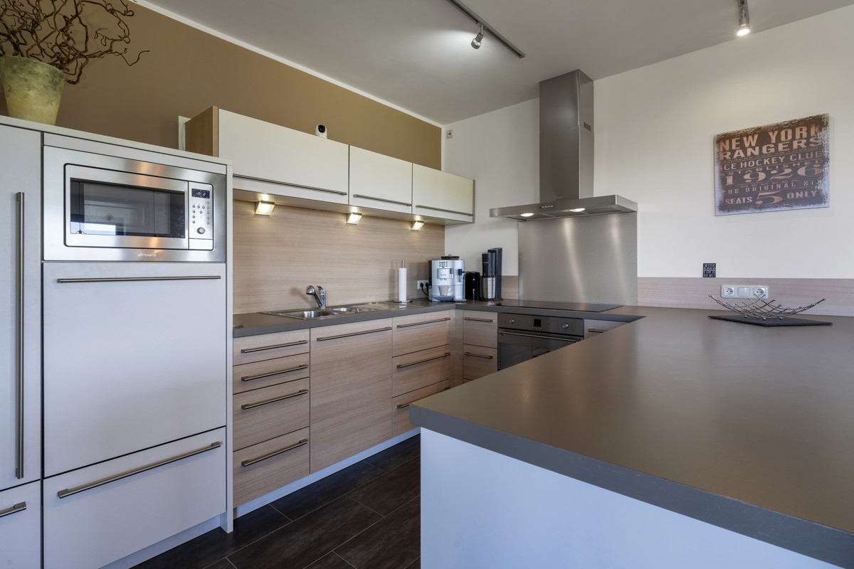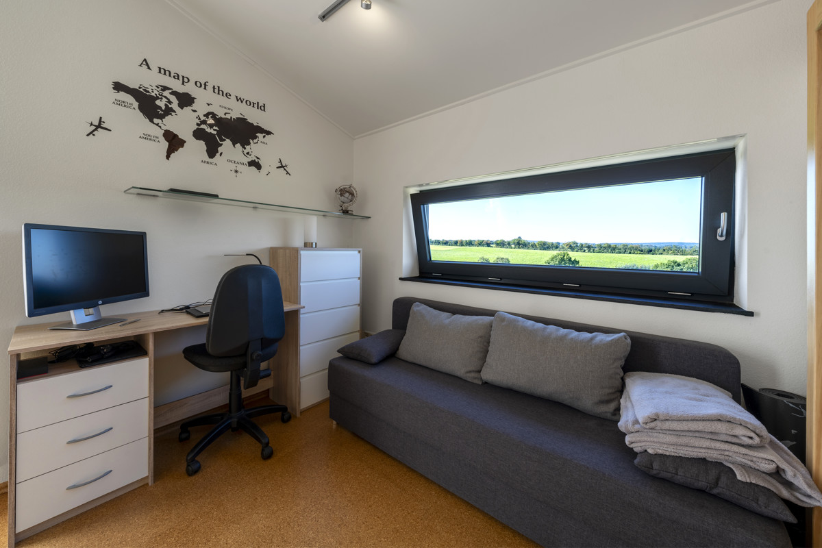 Im Erdgeschoss erwartet Sie ein lichtdurchfluteter offener Wohn- und Essbereich, der viel Platz für gemütliche Stunden mit der Familie und Freunden bietet. Die moderne und hochwertige Einbauküche verfügt über eine praktische Theke, an der Sie morgens Ihren Kaffee genießen können. Ein Gäste-WC mit Dusche, eine Garderobe und ein Vorratsraum sorgen für zusätzlichen Komfort. Die große Garage bietet viel Stauraum und Platz für Ihr Auto, Fahrräder, Motorräder und Co. Von der Terrasse aus können Sie den Blick ins Grüne in vollen Zügen genießen. Im Obergeschoss finden Sie ein geräumiges und helles Schlafzimmer, ein Kinderzimmer und ein Büro, das sich perfekt als Homeoffice eignet. Ein weiteres großzügiges Badezimmer sowie ein Hauswirtschaftsraum runden diese Etage ab. Besonders beeindruckend ist die Galerie im Flur, von der aus Sie einen Blick ins Erdgeschoss haben, was dem Haus eine einzigartige, offene Atmosphäre verleiht.