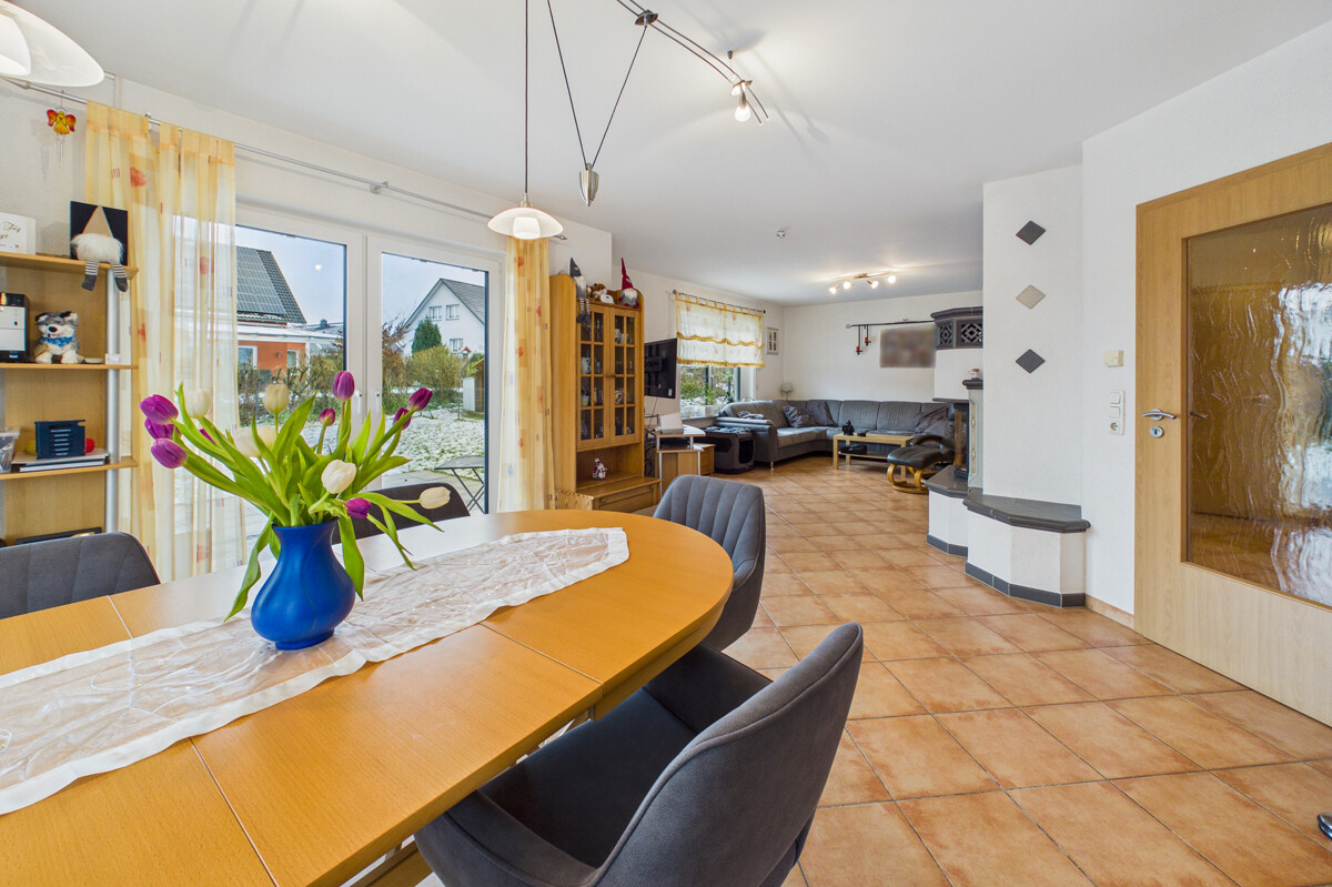 Im Erdgeschoss bildet der großzügige Wohn- und Essbereich das Herzstück des Hauses und schafft viel Platz für gemeinsames Wohnen und gesellige Stunden. Ein stilvoller Kaminofen sorgt dabei für eine besonders gemütliche Atmosphäre. Von hier aus gelangen Sie direkt auf die teilweise überdachte Terrasse sowie in den angrenzenden Garten. Ergänzt wird diese Ebene durch eine separate Küche, ein Gäste-WC und ein Büro. Besonders praktisch ist zudem der direkte Zugang zur sehr geräumigen Doppelgarage. Vor der Garage befinden sich zwei Stellplätze; bei hintereinander abgestellten Fahrzeugen lassen sich hier insgesamt bis zu vier Autos unterbringen. Im Obergeschoss empfängt Sie eine Galerie, die dem Haus eine offene Wohnatmosphäre verleiht.