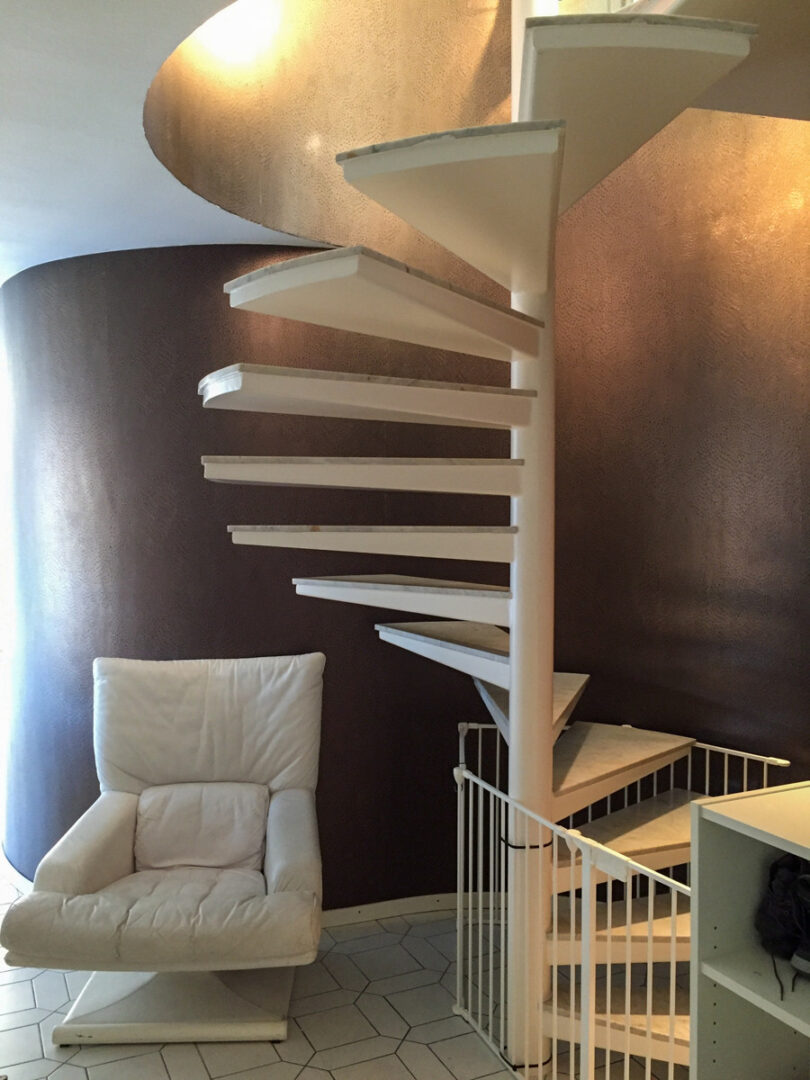 Eine elegante Wendeltreppe führt ins Dachgeschoss, wo sich weitere Wohnmöglichkeiten eröffnen.