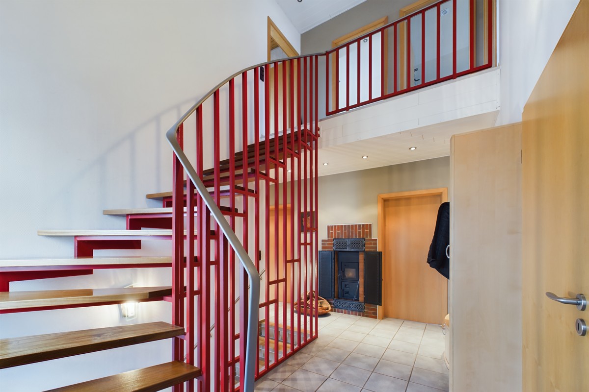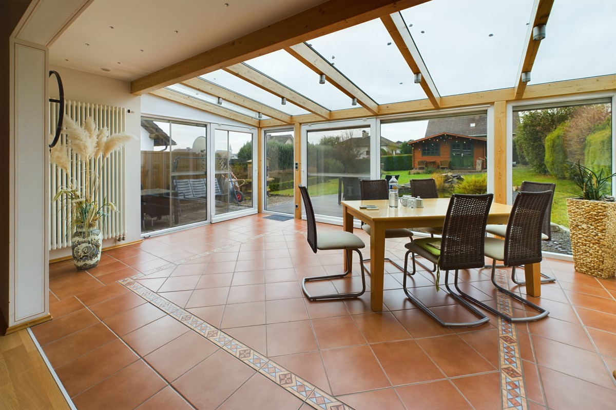 Im Erdgeschoss erwartet Sie ein offener Wohnbereich, der nahtlos in einen lichtdurchfluteten Wintergarten übergeht. Der Wintergarten eröffnet einen herrlichen Blick auf den Garten und den Teich. Die hochwertige Küche grenzt an den Wohnbereich. Ein Badezimmer mit Dusche und Badewanne, ein praktischer Abstellraum und ein Schlafzimmer vervollständigen das Erdgeschoss. Der offene Flur wird von dem gemütlichen Kachelofen erwärmt, der die Wärme perfekt ins obere Geschoss verteilt. Das obere Geschoss ermöglicht Ihnen und Ihrer Familie den perfekten Rückzugsort.