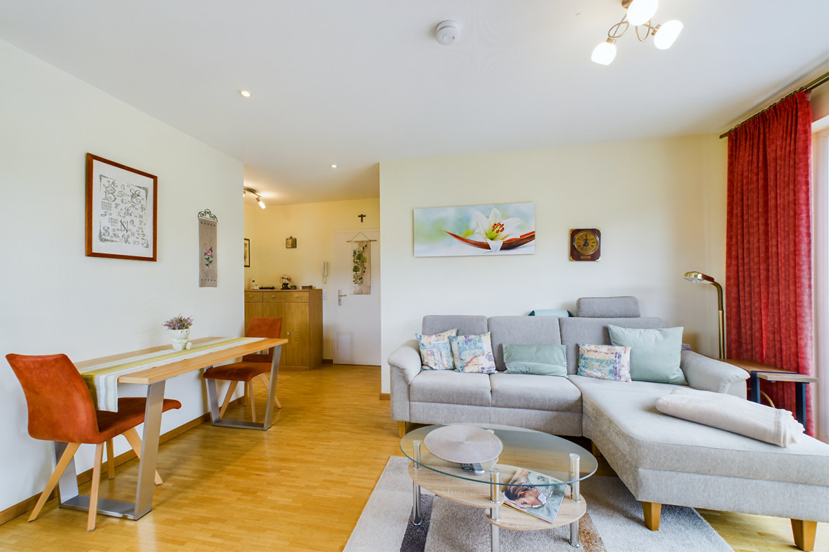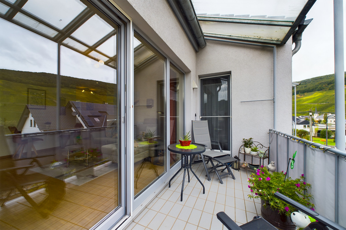 Der lichtdurchflutete Wohnbereich mit direktem Zugang zum Balkon schafft eine helle und einladende Atmosphäre. Von dem Balkon aus haben Sie eine herrliche Aussicht auf die Mosel und die umliegenden Weinberge.