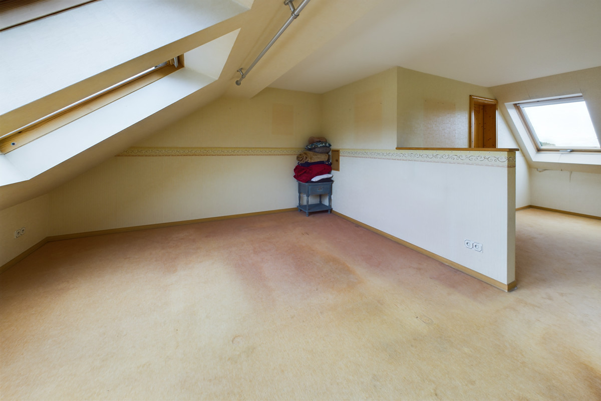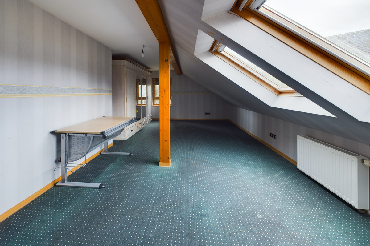 Ein Schlafzimmer sowie ein weiteres Badezimmer ergänzen das Raumangebot. Zusätzlich gibt es einen Balkon, der von dem Flur aus zuggängig ist. Der Dachboden dient als weiterer Stauraum.