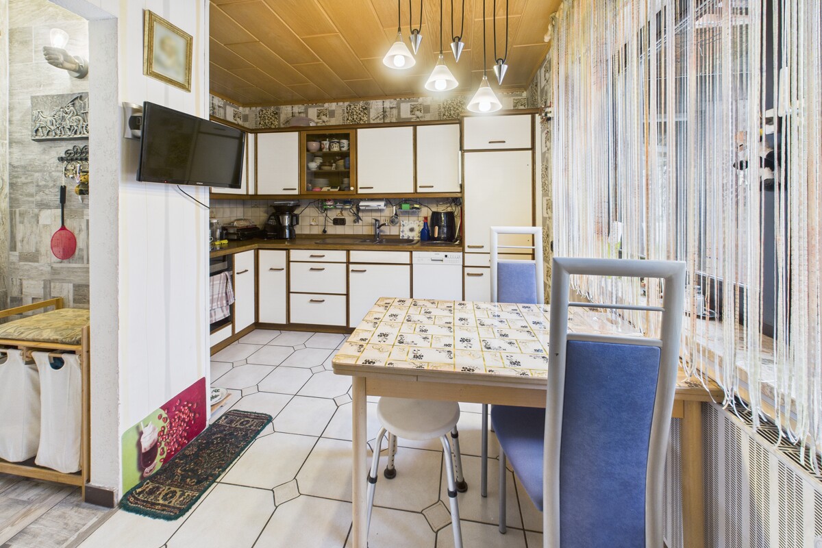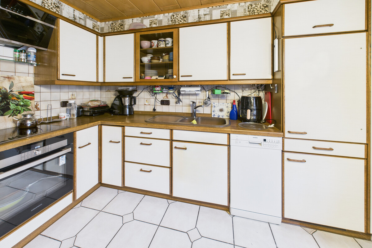 Im Erdgeschoss befindet sich ein großes Wohnzimmer, das den zentralen Wohnbereich des Hauses bildet und direkt an das angrenzende Esszimmer anschließt. Vom Wohnzimmer aus gelangt man auf die überdachte Terrasse sowie in den Garten. Auf dieser Etage befindet sich außerdem eine separate Küche mit angrenzender Speisekammer. Ergänzt wird das Erdgeschoss durch einen weiteren kleinen Wohnbereich, der sich beispielsweise als Büro oder zusätzlicher Aufenthaltsraum nutzen lässt. Ein Badezimmer mit Dusche ist ebenfalls vorhanden. Das Dachgeschoss verfügt über drei Schlafzimmer sowie ein weiteres Büro. Zusätzlich befindet sich auf dieser Etage eine Küche mit Wohnbereich, wodurch sich dieser Bereich gut als separater Wohnraum nutzen lässt, etwa für jugendliche Kinder, Gäste oder ein Mehrgenerationenkonzept. Ein Badezimmer mit Badewanne rundet das Raumangebot im Dachgeschoss ab.