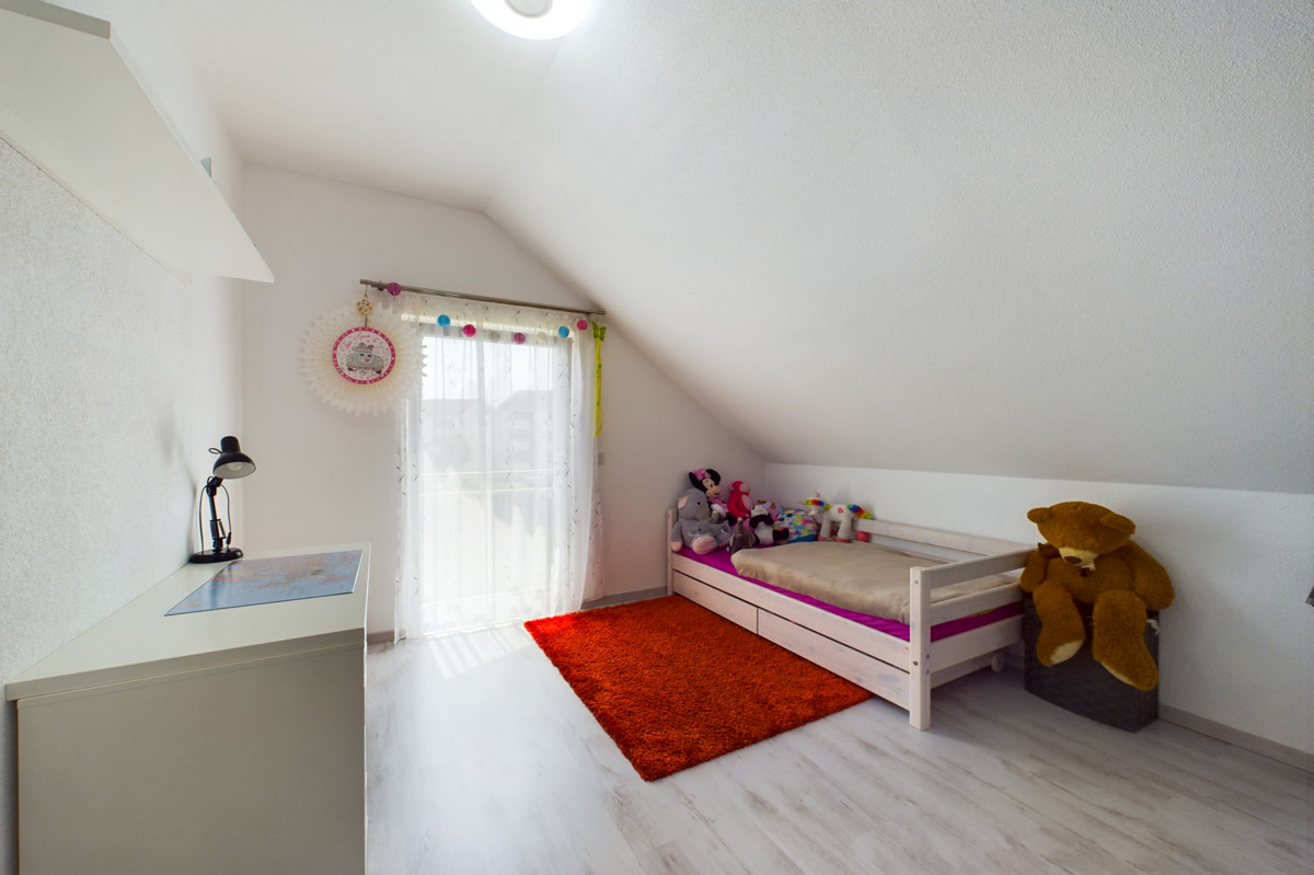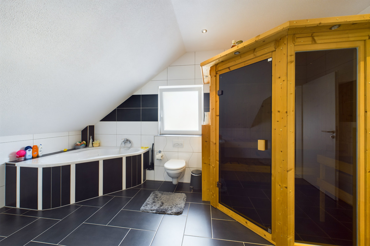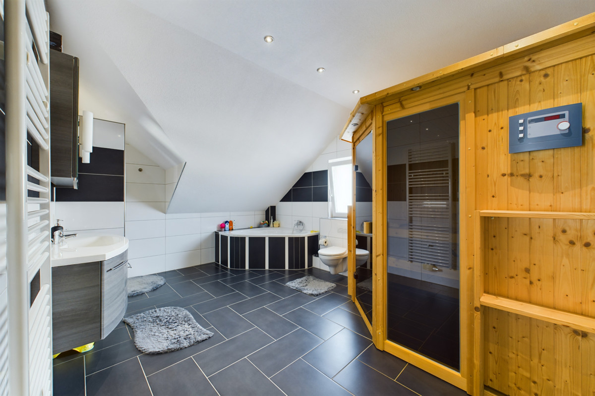Im Obergeschoss erwarten Sie drei Schlafzimmer, von denen zwei über ein angrenzendes Ankleidezimmer verfügen. Das Badezimmer auf dieser Etage lässt keine Wünsche offen: Es verfügt über eine bodentiefe Dusche, eine großzügige Badewanne und eine Sauna, die für entspannende Wellness-Momente sorgt. Ein Balkon vervollständigt diese Ebene.