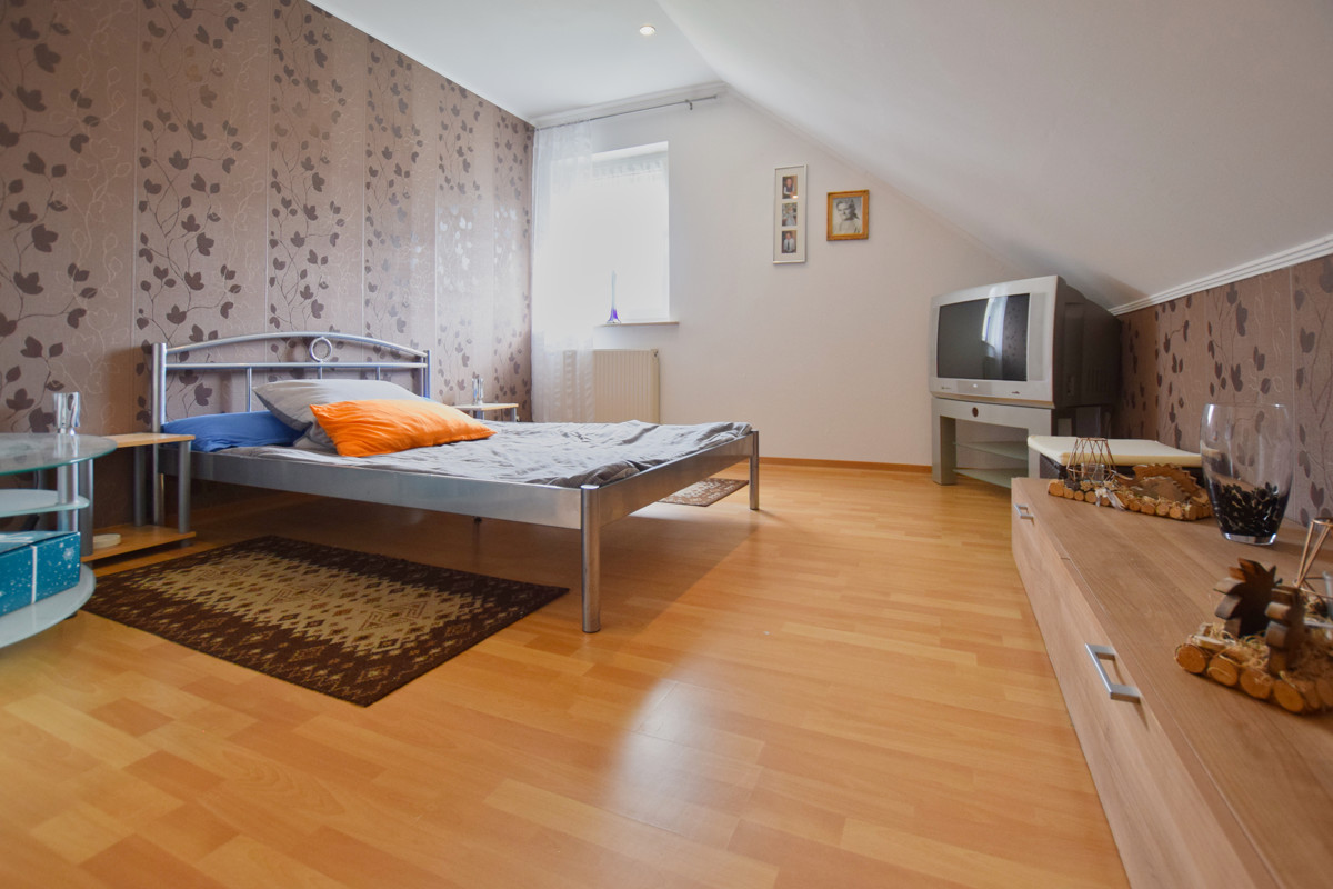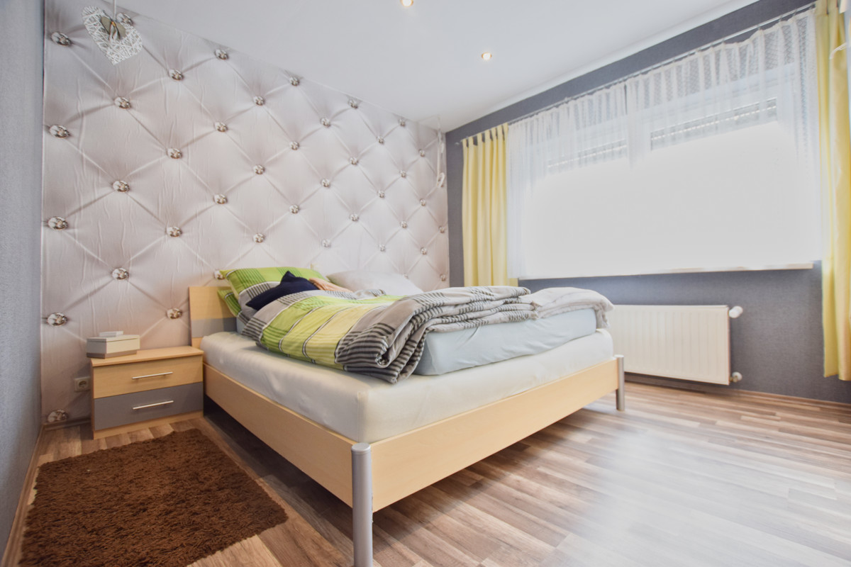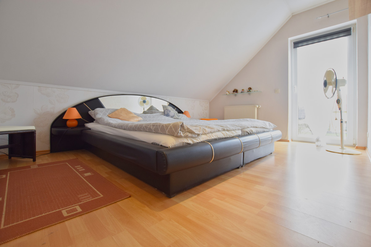 Die zwei Schlafzimmer sowie das Badezimmer mit Dusche im Obergeschoss sind hell und gemütlich. Zudem befindet sich auf der obersten Etage ein weiterer Wohnraum mit Küche und Zugang zum Balkon.