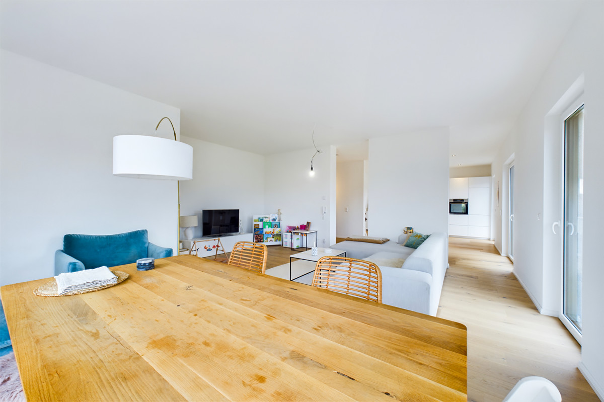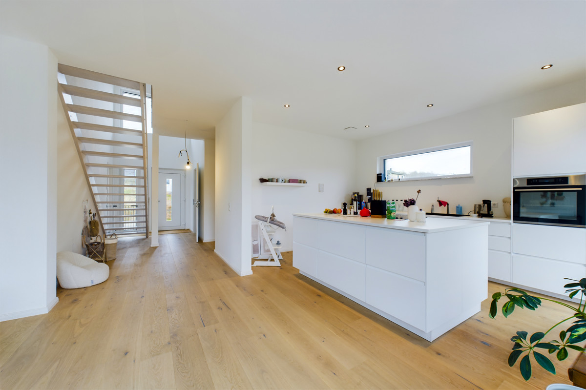 Die offene Gestaltung des Erdgeschosses schafft ein großzügiges und freundliches Ambiente. Die vollausgestattete Küche mit einer stilvollen Kücheninsel ist das Herzstück des Hauses und lädt zum gemeinsamen Kochen und Genießen ein. Der offene Wohnbereich, der durch bodentiefe Fenster lichtdurchflutet ist, eignet sich für ein gemütliches Beisammensein. Von hier aus gelangt man in den Garten, welchen Sie nach Ihren Wünschen gestalten können.