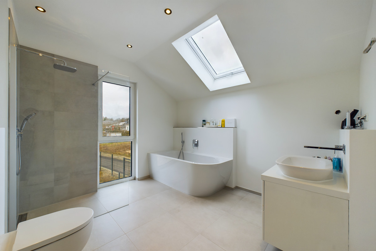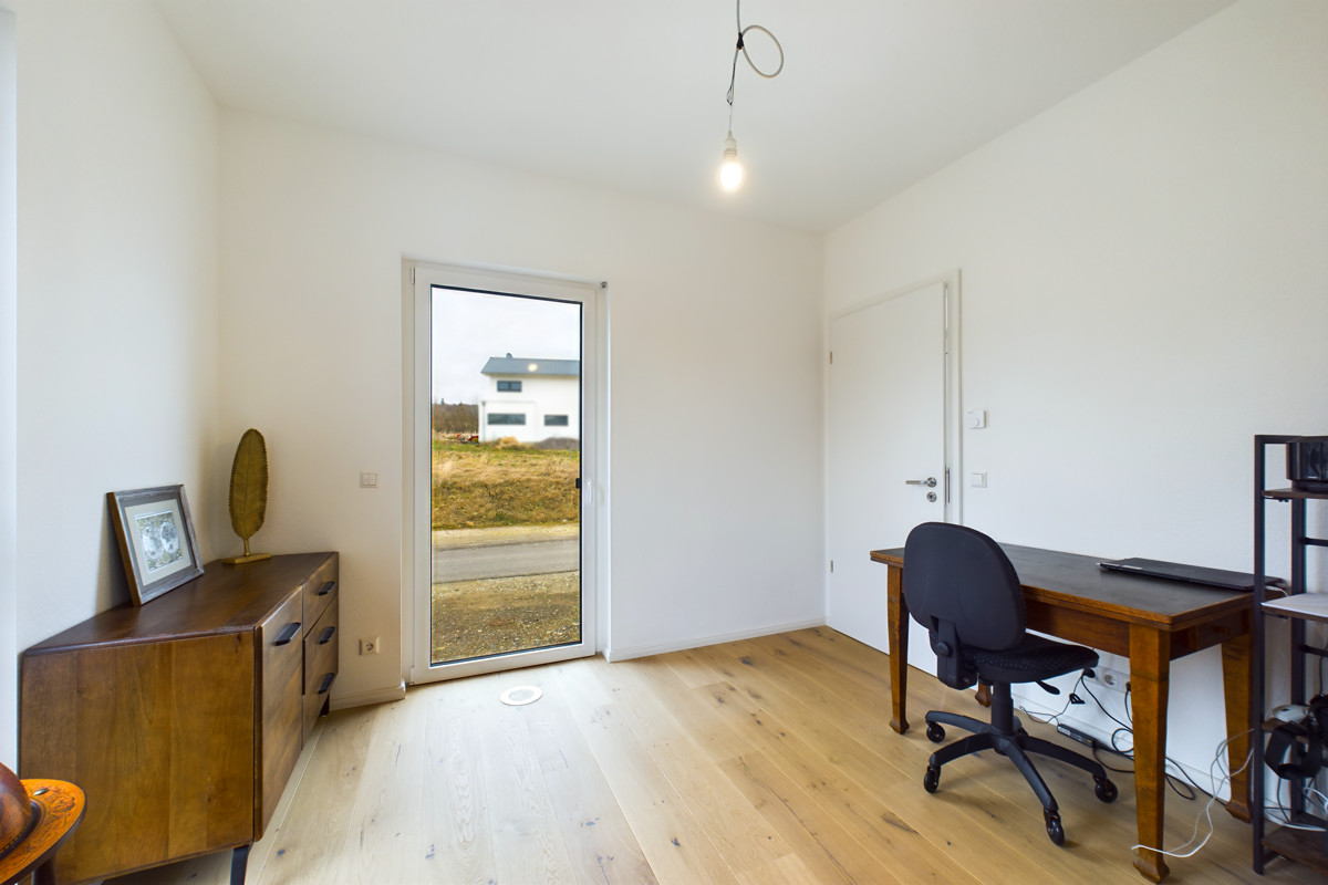 Ein modernes Badezimmer mit hochwertiger Ausstattung, ein praktischer Hauswirtschaftsraum, ein Büro und eine Garderobe vervollständigen das Erdgeschoss.