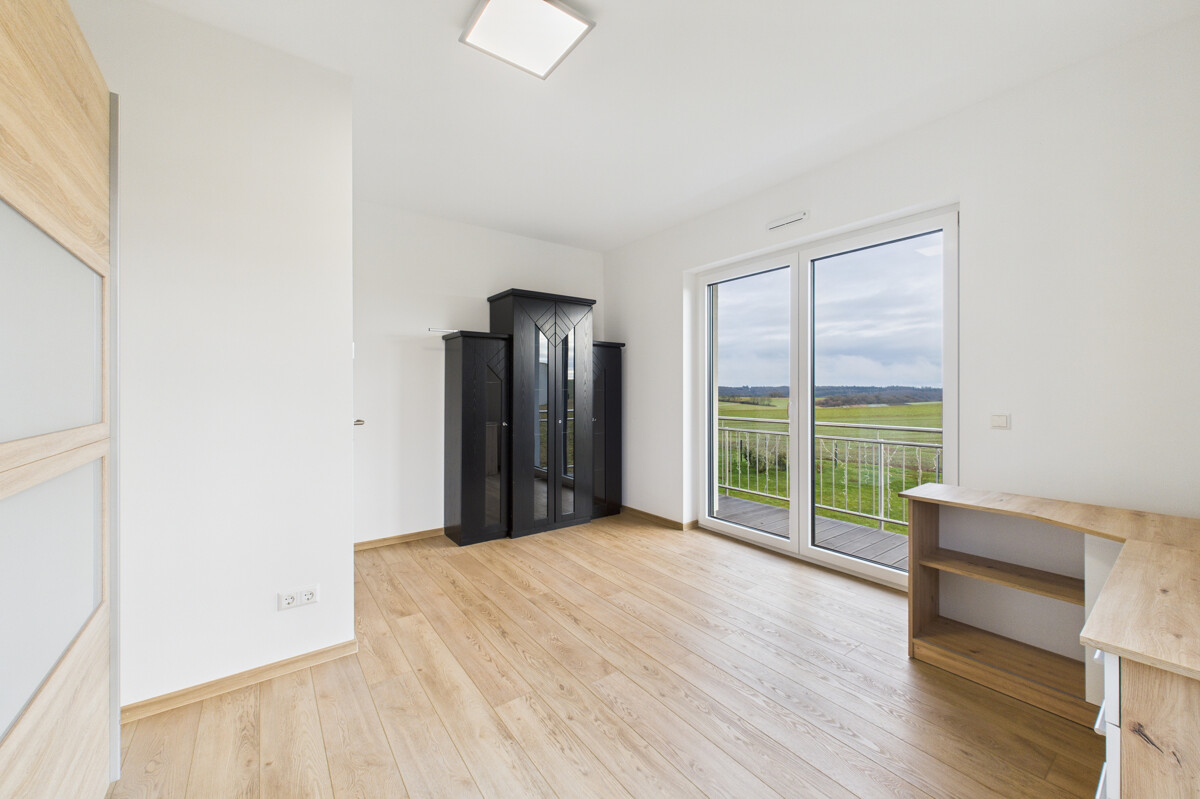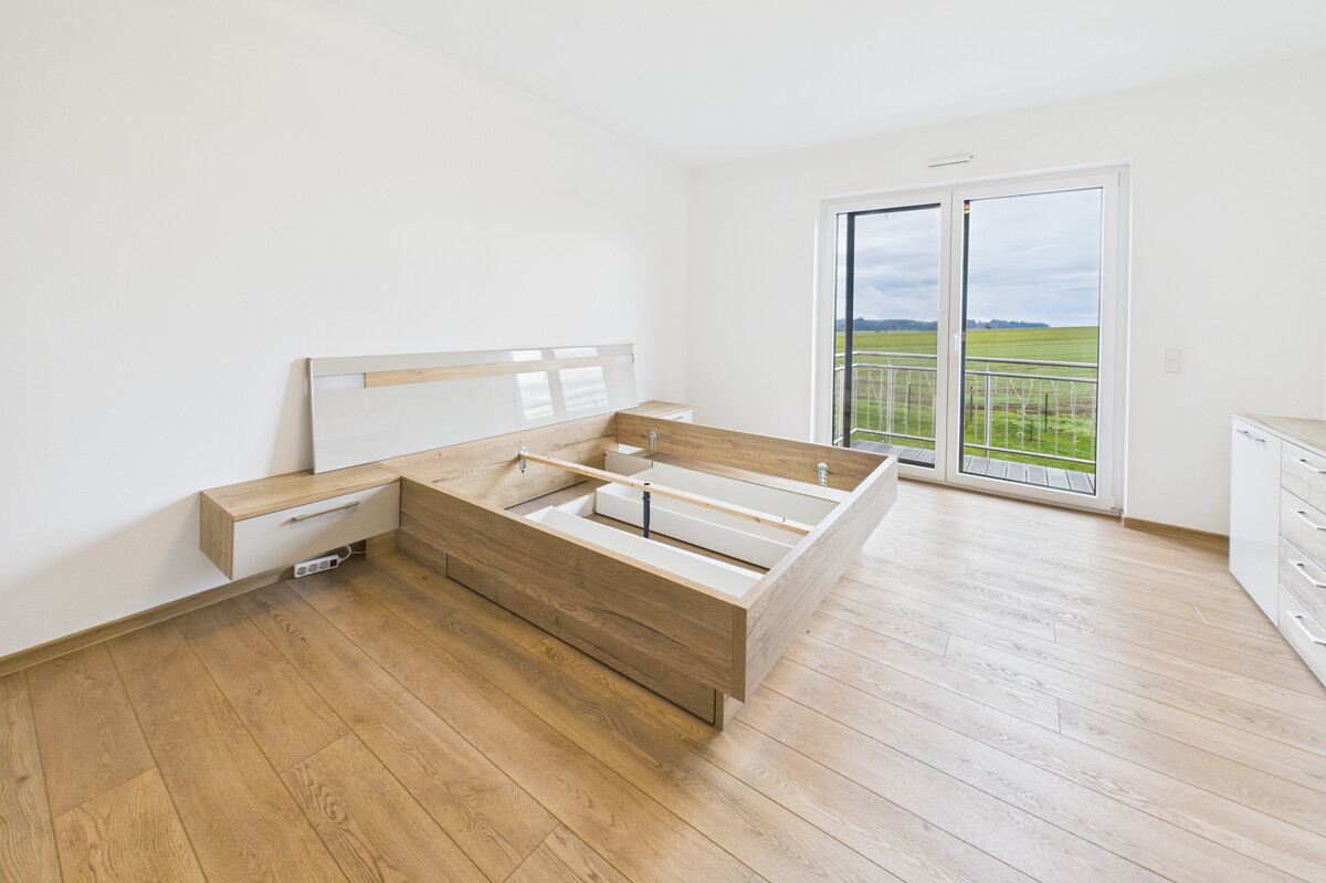 Im Obergeschoss befinden sich drei gut geschnittene Schlafzimmer, von denen zwei über einen direkten Zugang zum Balkon verfügen. Von hier aus genießen Sie einen schönen Weitblick und können den Tag entspannt beginnen oder ausklingen lassen. Das helle Badezimmer ist mit Dusche und Badewanne ausgestattet.