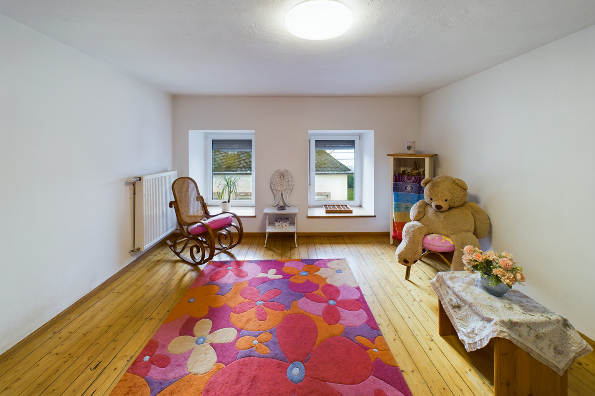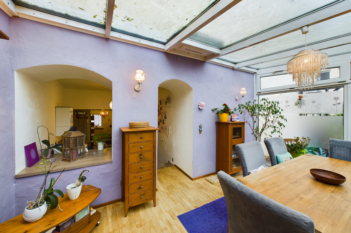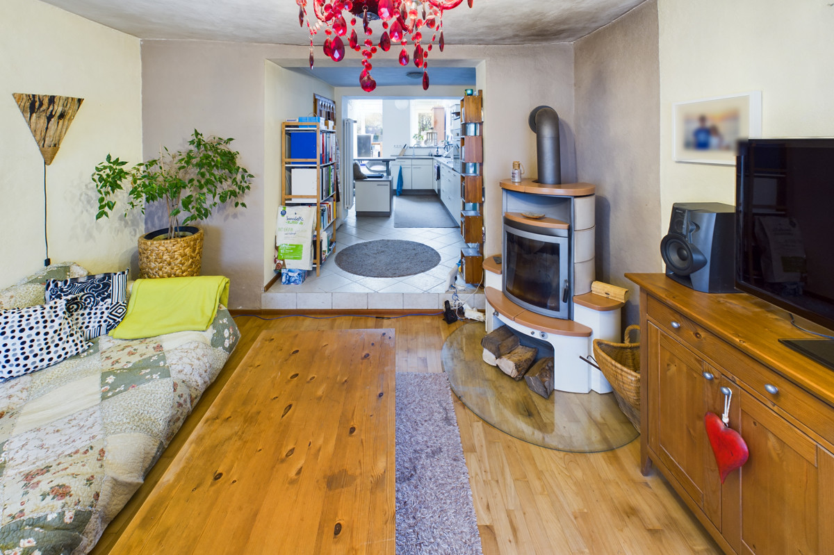 Die Küche im Erdgeschoss bildet den Mittelpunkt des Hauses, während der angrenzende Wintergarten die Etage mit Licht durchflutet. Hier haben Sie einen direkten Zugang zur einladenden Terrasse und dem Garten. Das gemütliche Wohnzimmer mit Holzofen lädt zum Verweilen ein. Ihr Trockner sowie die Waschmaschine finden im Hauswirtschaftsraum ihren Platz. Zudem können Sie von hier aus den Speicher der alten Scheune erreichen. Hier wird Ihnen jede Menge Stauraum geboten. Die angrenzende Garage bietet einen direkten Zugang ins Haus und ermöglicht ein bequemes Parken. Ein Gäste-WC vervollständigt das Erdgeschoss. Privatsphäre gibt es im Obergeschoss. Hier erwarten Sie zwei gemütliche Schlafzimmer sowie ein Badezimmer mit Badewanne und Dusche.
