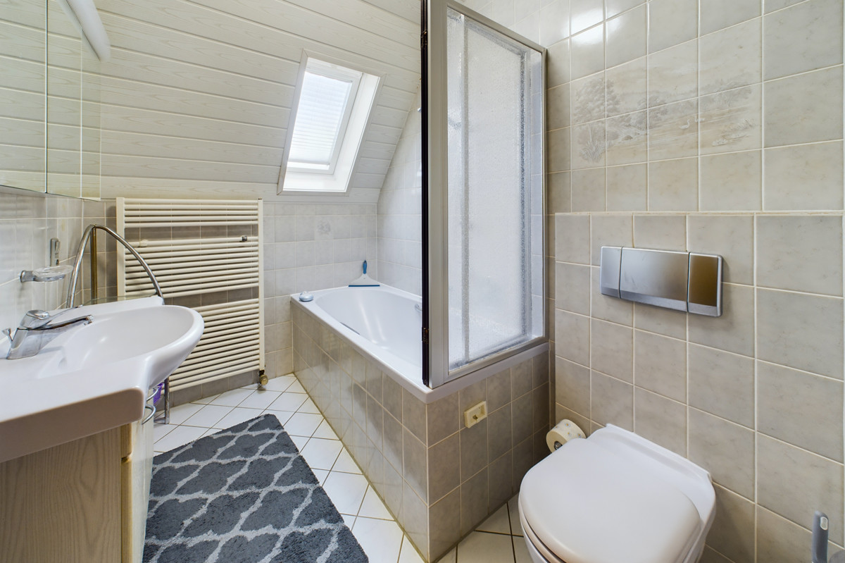 Im Obergeschoss befinden sich zwei geräumige Schlafzimmer sowie ein Durchgangszimmer, das sich ideal als Büro oder Ankleidezimmer eignet. Ein weiteres Badezimmer mit Badewanne sorgt für zusätzlichen Komfort.