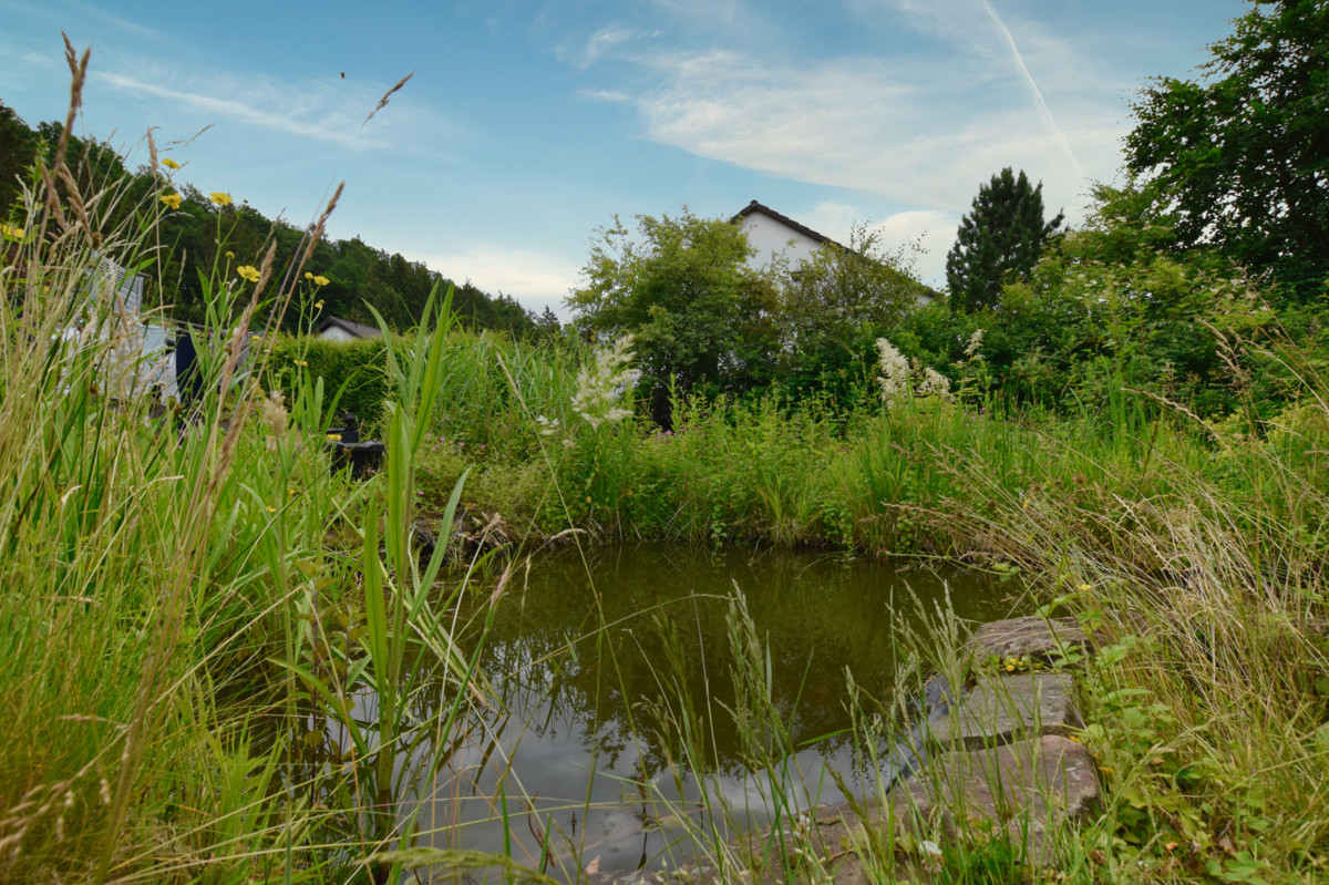 Das absolute Highlight bei dieser Immobilie ist der wunderschöne Garten mit Blick ins Grüne. Hier fühlt sich Zuhause wie Urlaub an. Der Garten mit kleinem Teich und großer Terrasse lässt dennoch Raum zur individuellen Gestaltung.