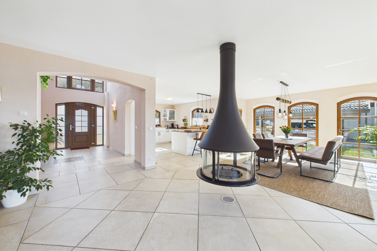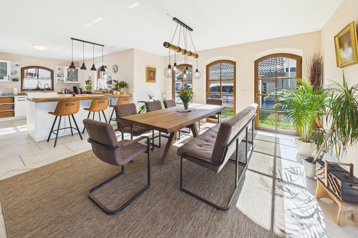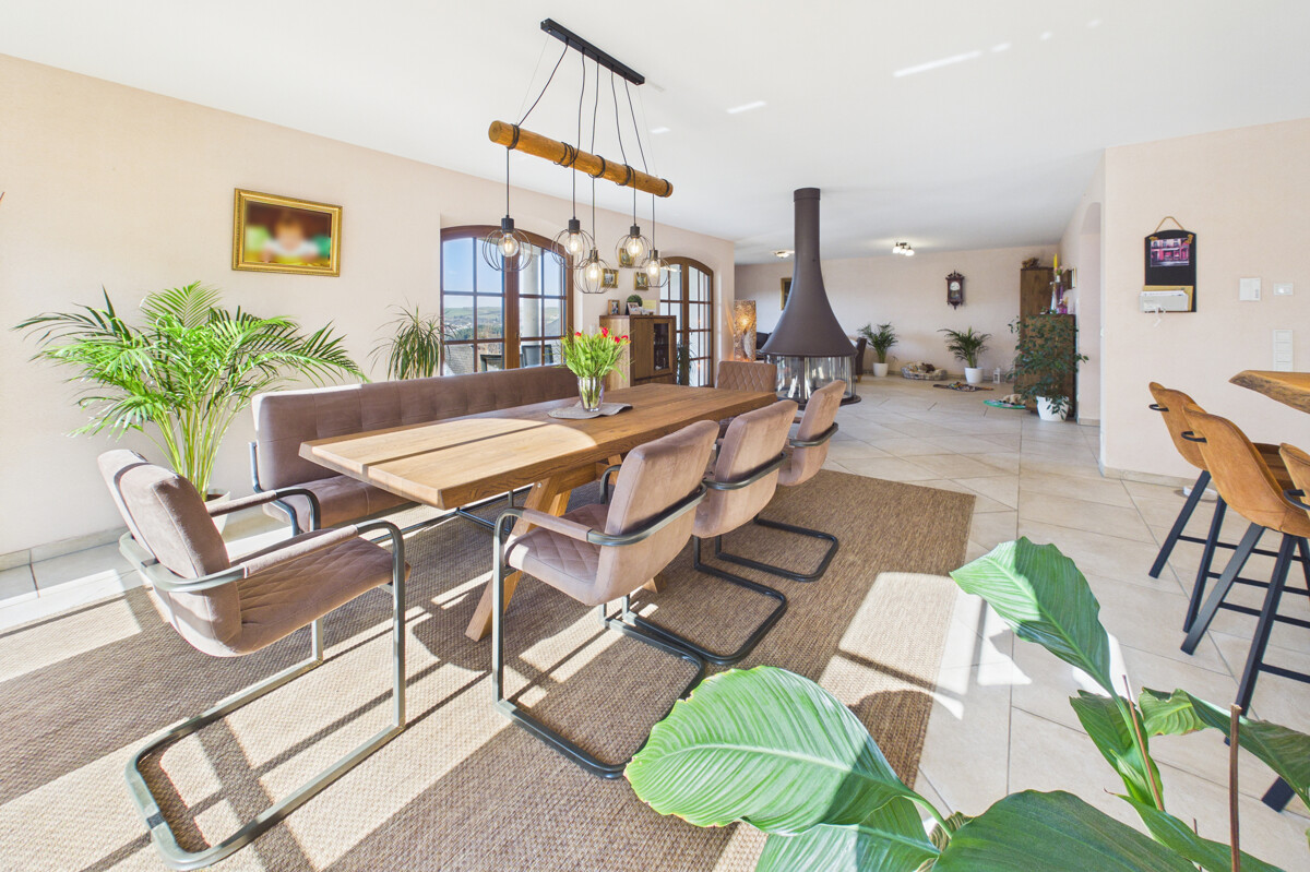 Bereits beim Betreten des Hauses empfängt Sie ein großzügiger, offen gestalteter Eingangsbereich, der direkt in den weitläufigen Wohn-, Ess- und Küchenbereich übergeht. Dieser bildet das Herzstück des Hauses und beeindruckt durch seine Größe, die offene Gestaltung sowie die helle und freundliche Atmosphäre. Große Fensterflächen sorgen für viel Tageslicht und unterstreichen das moderne Wohnkonzept. Die stilvolle Küche fügt sich harmonisch in den Raum ein, während ein zentral platzierter Ofen für eine besonders gemütliche Atmosphäre sorgt. Vom Wohnbereich aus gelangen Sie direkt auf die überdachte Terrasse, von der aus sich ein traumhafter Weitblick genießen lässt und die zu geselligen Stunden im Freien einlädt. Das Erdgeschoss wird durch ein Gäste-WC ergänzt. Zudem besteht von hier aus ein direkter Zugang zur Doppelgarage.