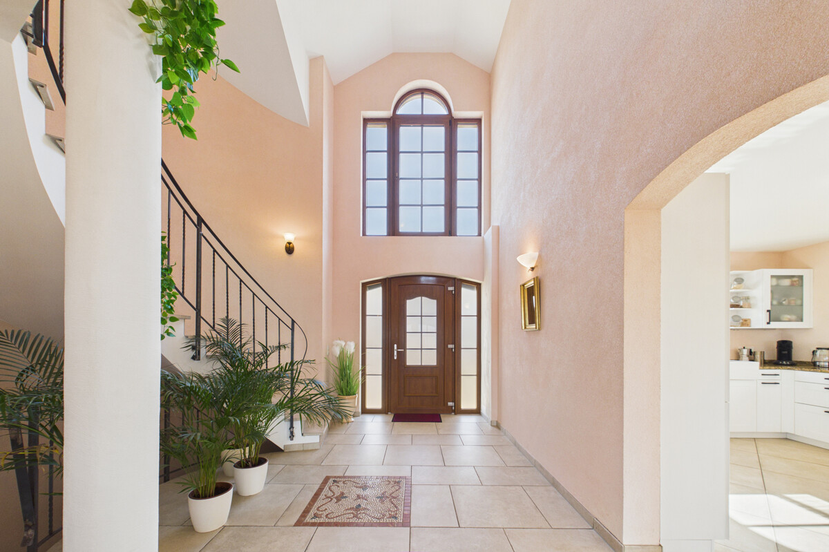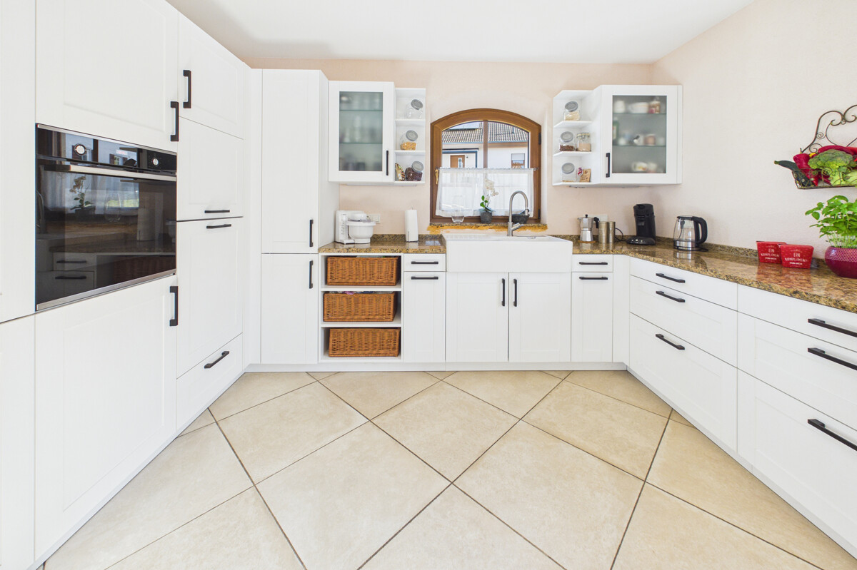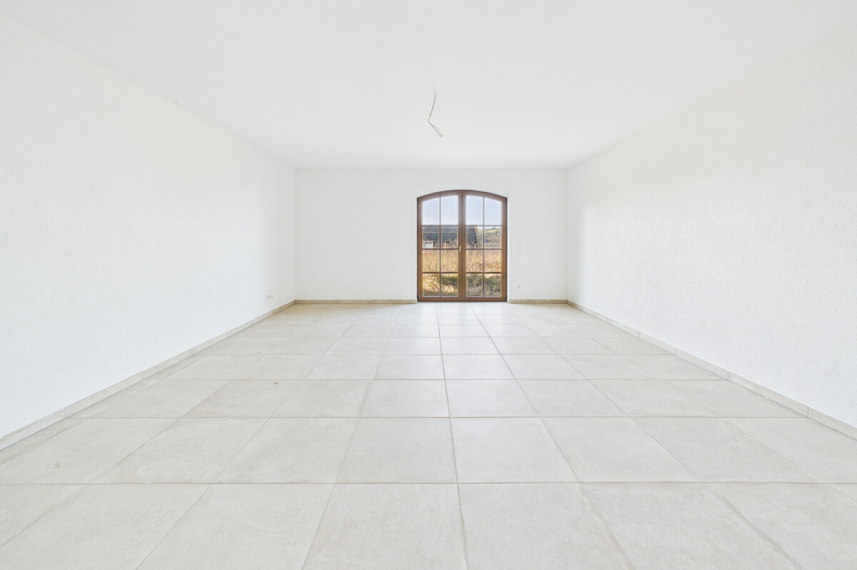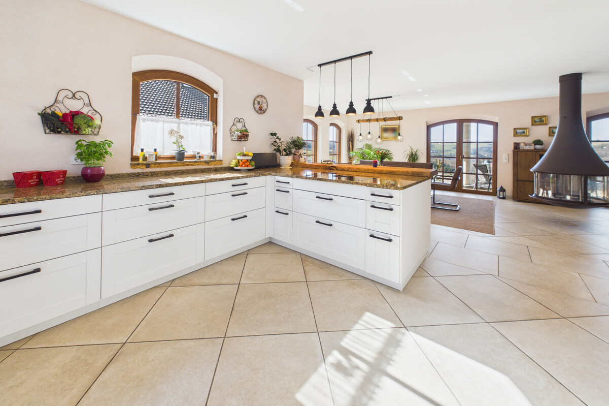 Bereits beim Betreten des Hauses empfängt Sie ein großzügiger, offen gestalteter Eingangsbereich, der direkt in den weitläufigen Wohn-, Ess- und Küchenbereich übergeht. Dieser bildet das Herzstück des Hauses und beeindruckt durch seine Größe, die offene Gestaltung sowie die helle und freundliche Atmosphäre. Große Fensterflächen sorgen für viel Tageslicht und unterstreichen das moderne Wohnkonzept. Die stilvolle Küche fügt sich harmonisch in den Raum ein, während ein zentral platzierter Ofen für eine besonders gemütliche Atmosphäre sorgt. Vom Wohnbereich aus gelangen Sie direkt auf die überdachte Terrasse, von der aus sich ein traumhafter Weitblick genießen lässt und die zu geselligen Stunden im Freien einlädt. Das Erdgeschoss wird durch ein Gäste-WC ergänzt. Zudem besteht von hier aus ein direkter Zugang zur Doppelgarage.