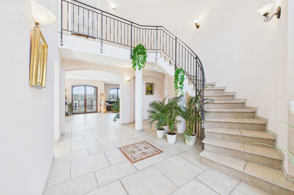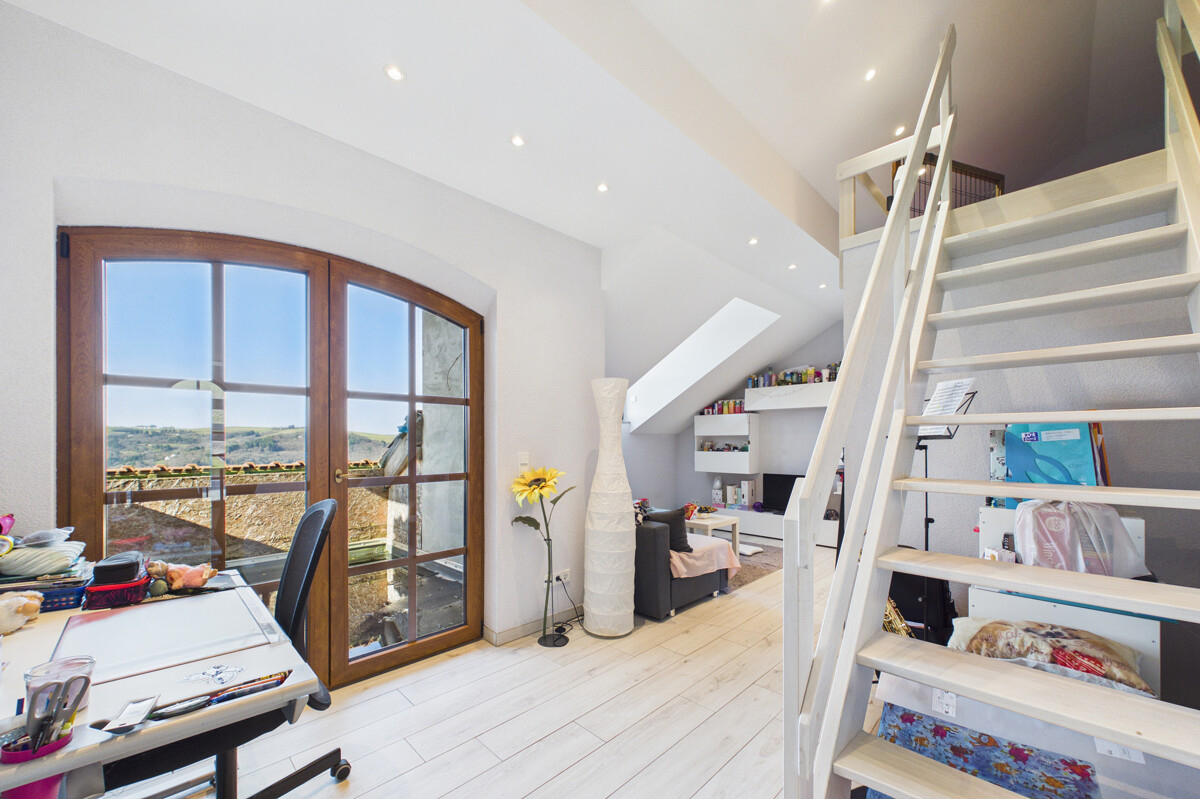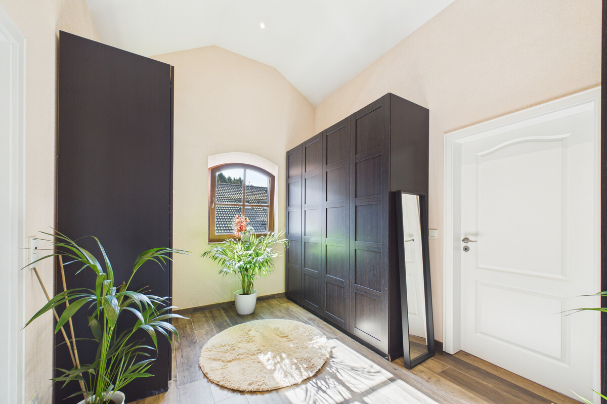 Im Obergeschoss befindet sich ein Schlafzimmer mit angrenzender Ankleide und einem Bad en Suite. Dieses ist mit Badewanne sowie Dusche ausgestattet und sorgt für hohen Wohnkomfort. Von hier aus gelangen Sie zudem auf einen Balkon mit schönem Weitblick. Ein weiteres Schlafzimmer erstreckt sich über eineinhalb Etagen und schafft dadurch ein besonderes Raumgefühl. Auch hier stehen eine Ankleide sowie ein Bad en Suite mit Dusche zur Verfügung. Ein besonderes Highlight dieses Bereichs ist der zugehörige Balkon mit herrlichem Weitblick. Über eine kleine Treppe innerhalb des Zimmers erreichen Sie einen zusätzlichen offenen Bereich im Dachgeschoss, der sich beispielsweise als Rückzugsecke nutzen lässt.