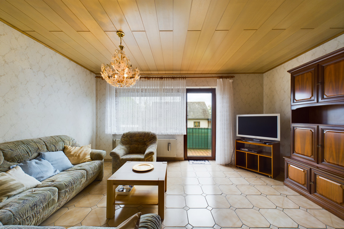Das Kellergeschoss ist dank großer Fenster und einem direkten Zugang nach draußen angenehm hell. Hier befinden sich zwei Schlafzimmer, die vielseitig nutzbar sind, ein Hauswirtschaftsraum, ein Badezimmer, eine Werkstatt und der Heizungsraum.