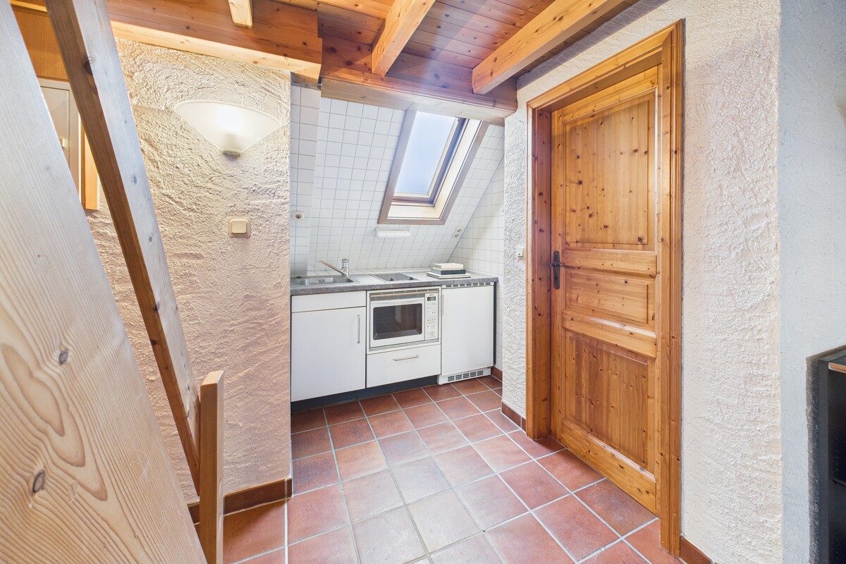 Die linke Haushälfte bildet eine abgeschlossene Wohnung. Im Erdgeschoss befinden sich eine Küche und ein Wohnbereich. Das Obergeschoss umfasst zwei Schlafzimmer sowie ein Badezimmer mit Dusche.