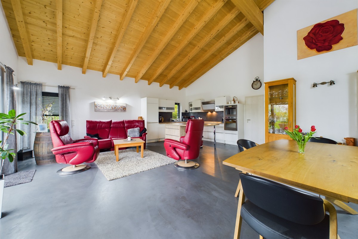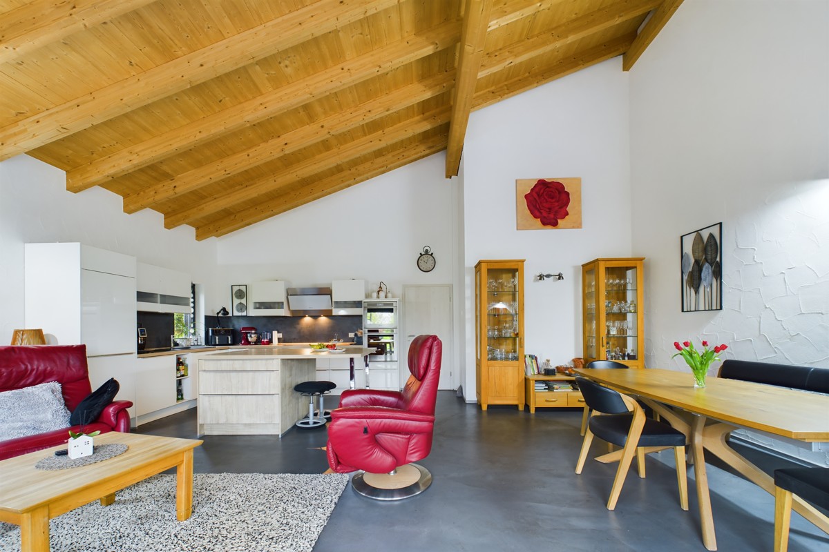 Die Haushälfte A bietet im Erdgeschoss einen großzügigen offenen Wohn- und Essbereich mit hohen Decken und großen Fensterfronten, die den Raum mit natürlichem Licht durchfluten und einen herrlichen Blick in den Garten ermöglichen. Ein komfortables Schlafzimmer und ein Badezimmer mit Dusche und Whirlpool Badewanne bieten Entspannung nach einem langen Tag. Ein Gäste-WC und ein praktischer Abstellraum ergänzen das Angebot. Die direkt zugängliche Terrasse lädt zu entspannten Stunden im Freien ein, während der angrenzende Garten Raum für kreative Gestaltungsmöglichkeiten und einen unverbaubaren Weitblick bietet. Eine Holztreppe führt auf den Dachboden, der als zusätzlicher Stauraum genutzt werden kann.