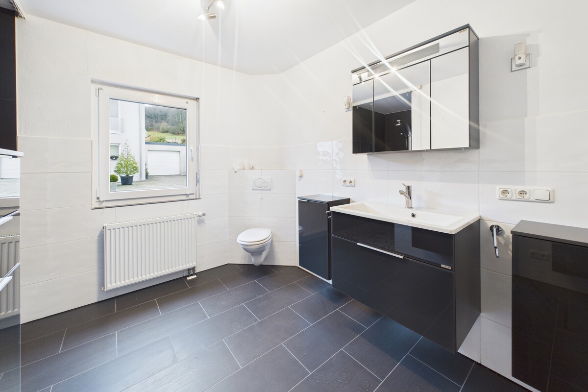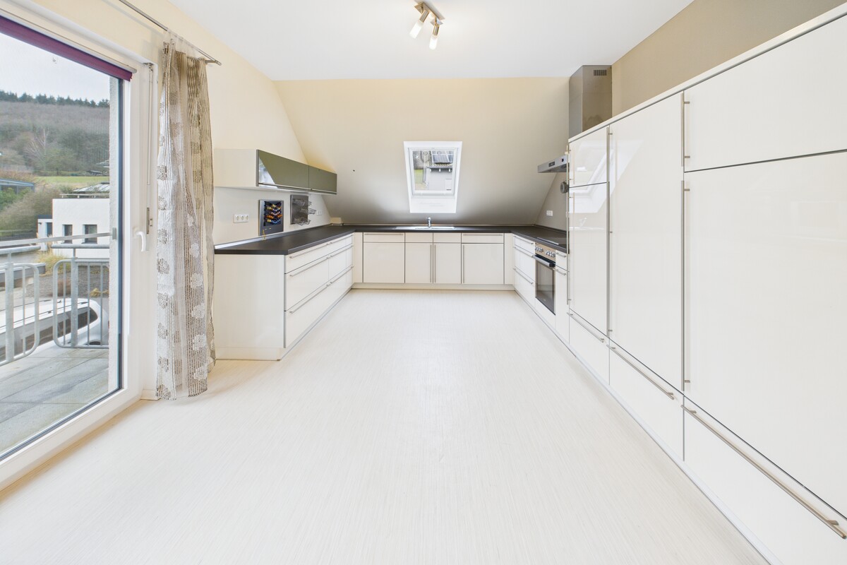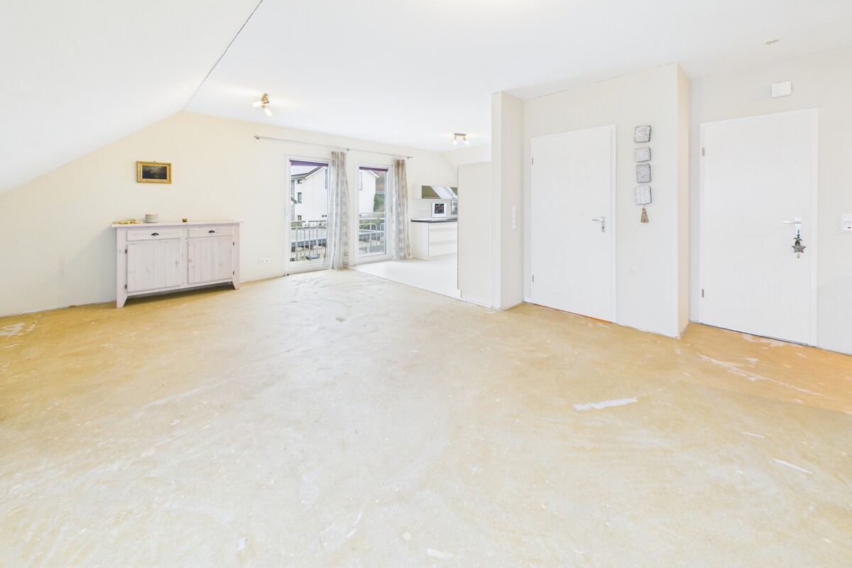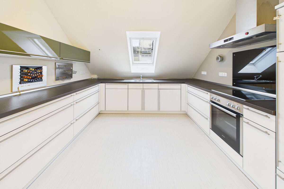 Auch die Wohneinheit im Obergeschoss überzeugt mit einem sehr großzügigen Wohn- und Küchenbereich inklusive hochwertiger, neuer Einbauküche und Zugang zum Balkon. Zwei Schlafzimmer, von denen eines über einen separaten Bereich für Ankleide oder Büro verfügt, sowie ein modernes Bad mit Dusche und Badewanne und eine separate Waschkammer sind hier vorhanden.