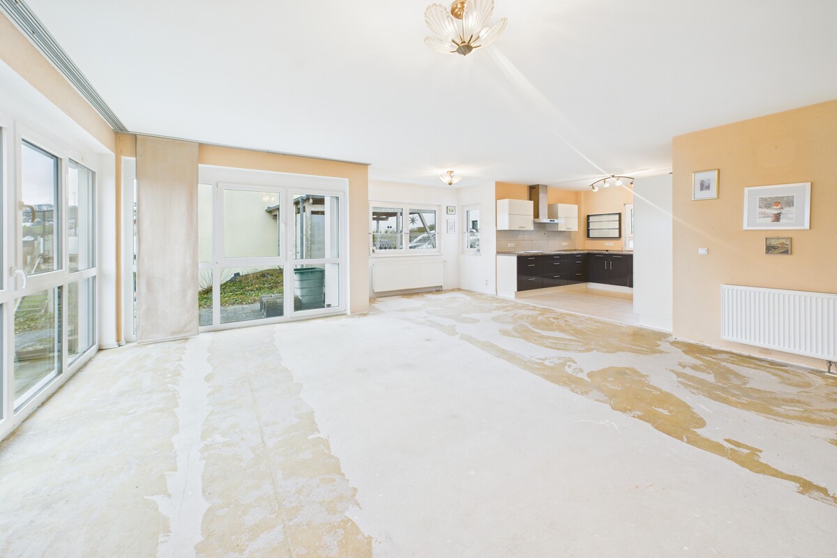 Die Wohneinheit im Erdgeschoss verfügt über einen großzügigen, lichtdurchfluteten Wohn- und Küchenbereich mit moderner Einbauküche und direktem Zugang zur Terrasse und zum Garten. Zudem stehen ein Schlafzimmer sowie zwei weitere flexibel nutzbare Zimmer zur Verfügung. Ein modernes Badezimmer mit Dusche sowie eine angrenzende Waschkammer ergänzen diese Etage.