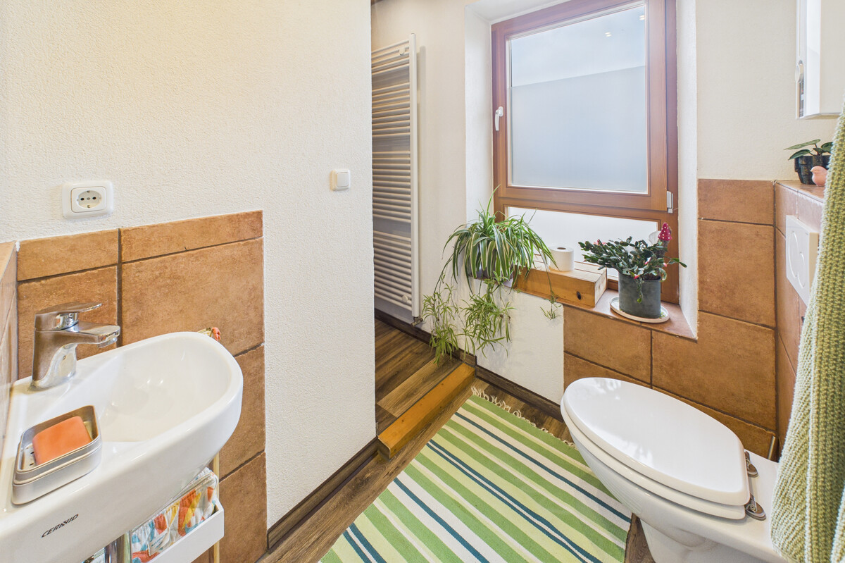Im Obergeschoss befindet sich eine abgeschlossene Wohnung, die derzeit vermietet ist und laufende Mieteinnahmen generiert. Die Wohnung verfügt über zwei Schlafzimmer, ein Durchgangszimmer zum Wohnzimmer, das aufgrund seiner Lage und Größe individuell genutzt werden kann, beispielsweise als Esszimmer, eine Küche, zwei Badezimmer sowie einen Terrasse. Der Zugang zu dieser Wohneinheit erfolgt über die Terrasse, was der Wohnung eine klare Abgrenzung und einen eigenen Charakter verleiht. Zur Wohnung gehört ein Wäscheraum, welcher sich im Erdgeschoss befindet und über eine Treppe zu erreichen ist.